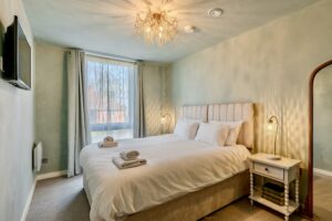 NO. 26 City Retreat provides unique touches and special features, not found in other holiday lets, creating a welcoming York experience. Located within a 7 minute walking distance of the town centre, this 2-bedroom, 2 bathroom flat also has free underground EV Parking, complimentary on-site gym, and upscale amenities.